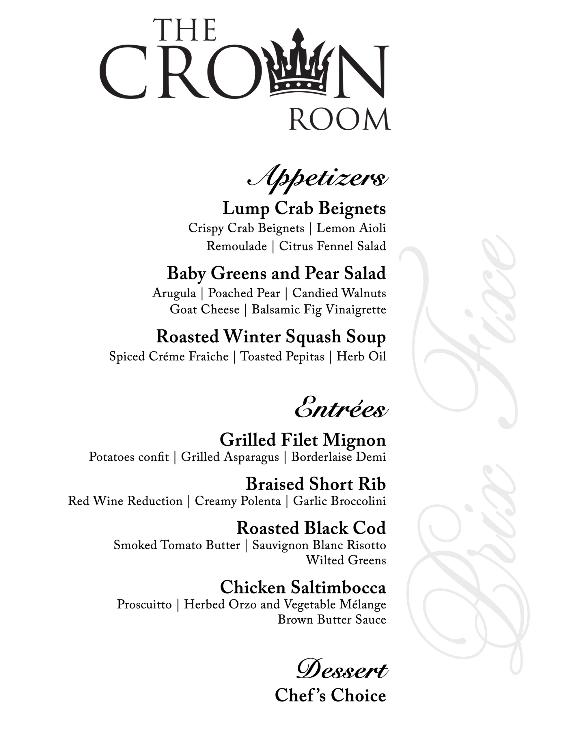 Discover an elevated dining experience in The Crown Room, where a thoughtfully crafted Prix Fixe Menu meets refined ambiance and impeccable service. Perfect for an intimate dinner or a special night out, The Crown Room offers a beautifully appointed setting designed to make every visit memorable. Join us on Fridays and Saturdays from 5:00 PM to 8:00 PM and indulge in an evening of exceptional cuisine and unmatched elegance. Our regular Prix Fixe menu is $49.95 per person.