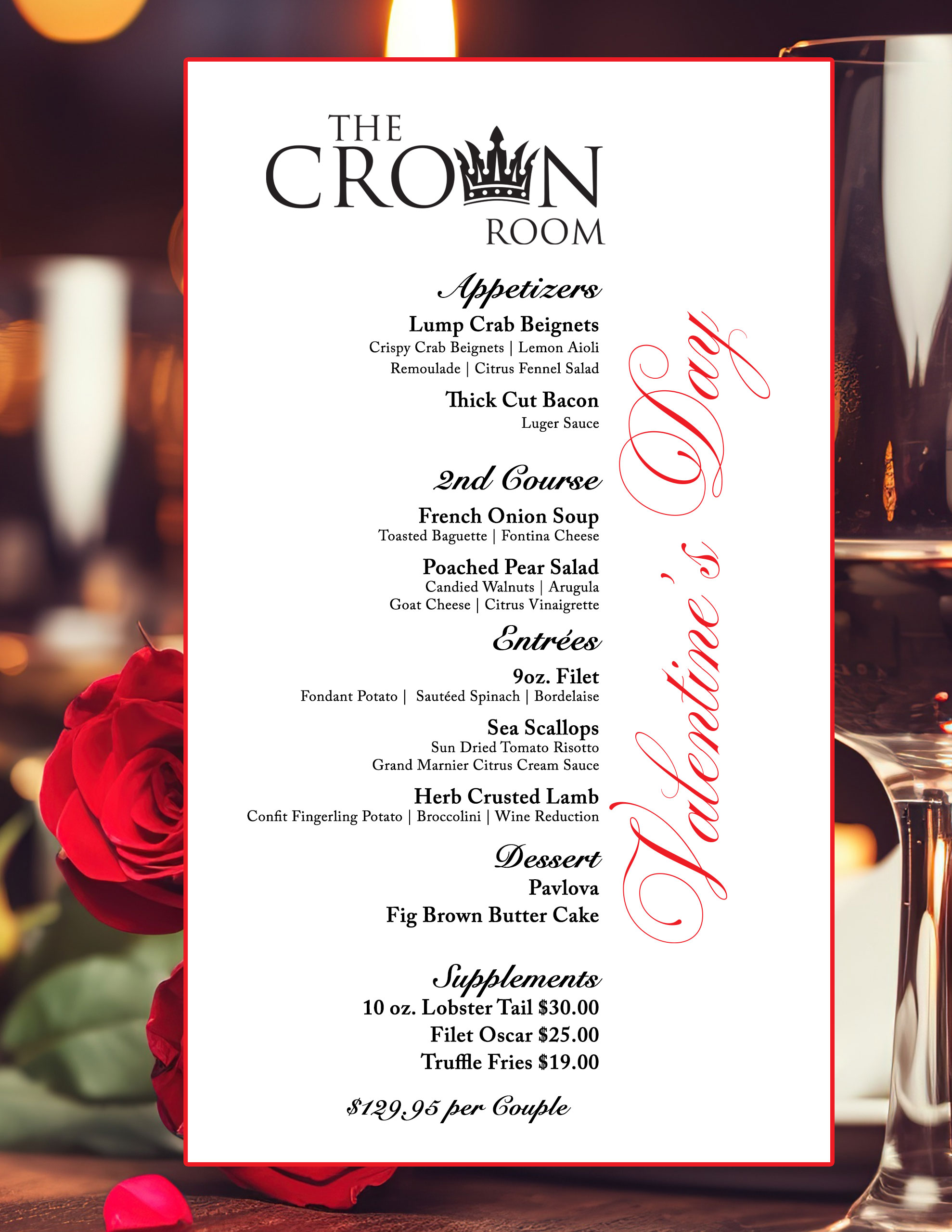 This exclusive menu is available only during Valentine’s Day weekend, so reservations are highly recommended. Make your reservations today and celebrate love in The Crown Room.